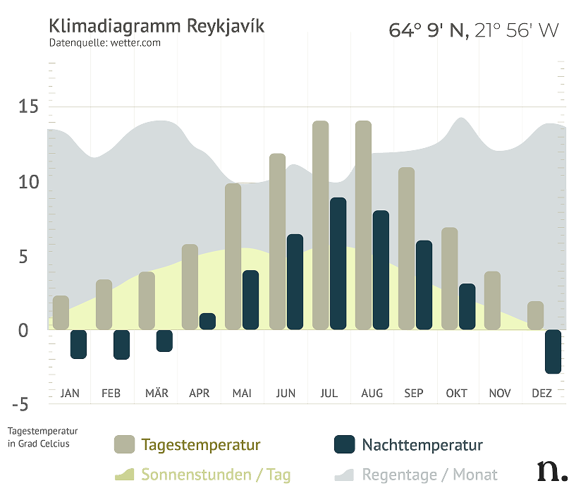 Folgendes Klimadiagramm von Reykjavík hilft dir, Temperaturen, Niederschläge und Sonnenstunden auf einen Blick zu vergleichen.
