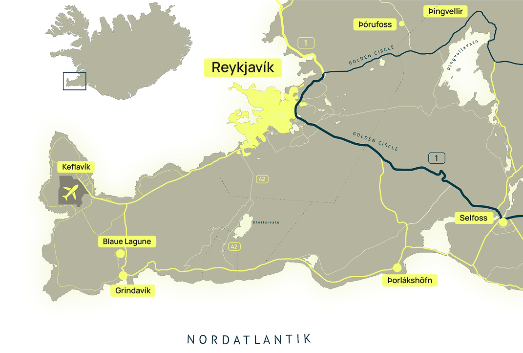 Damit du sofort einen Überblick bekommst, zeigt diese Karte Reykjavík, die Umgebung, Straßen, den Keflavík Airport sowie beliebte Ausflugsziele wie den Golden Circle und die Blaue Lagune. So siehst du auf einen Blick, wie alles zusammenhängt und wo deine ersten Abenteuer in Island starten.